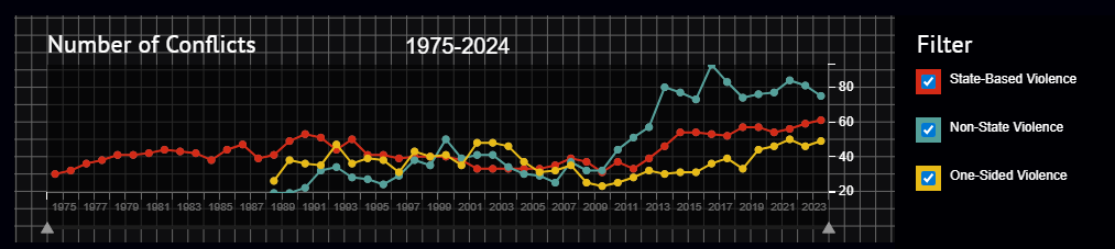 Vi lever i en tid där antalet väpnade konflikter är högre än på över 70 år, enligt internationella konfliktdata (bl a UCDP – Uppsala Conflict Data Program). Konfliktnivåerna är i dag de högsta sedan efterkrigstiden, och flera av de pågående krigen är de mest våldsamma på decennier.