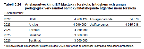 Anslaget för högre kvalitet i förskolan heter 1:7 Maxtaxa i förskola, fritidshem och annan pedagogisk verksamhet samt kvalitetshöjande åtgärder inom förskola. I regeringens första budget 2023 var anslaget 4,999 miljarder. 2026 är anslaget 5,760 miljarder. Ja, det ser ju ut som en ökning? Stämmer inte det?
